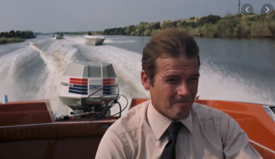 | Bond in the boat chase scene in "Live and Let Die" from 007museum.com |